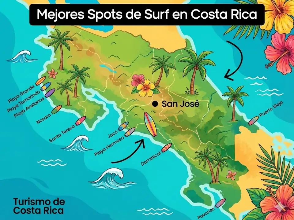 Te dejo un mapa esquemático con la ubicación de los principales destinos de Surf en Costa Rica: